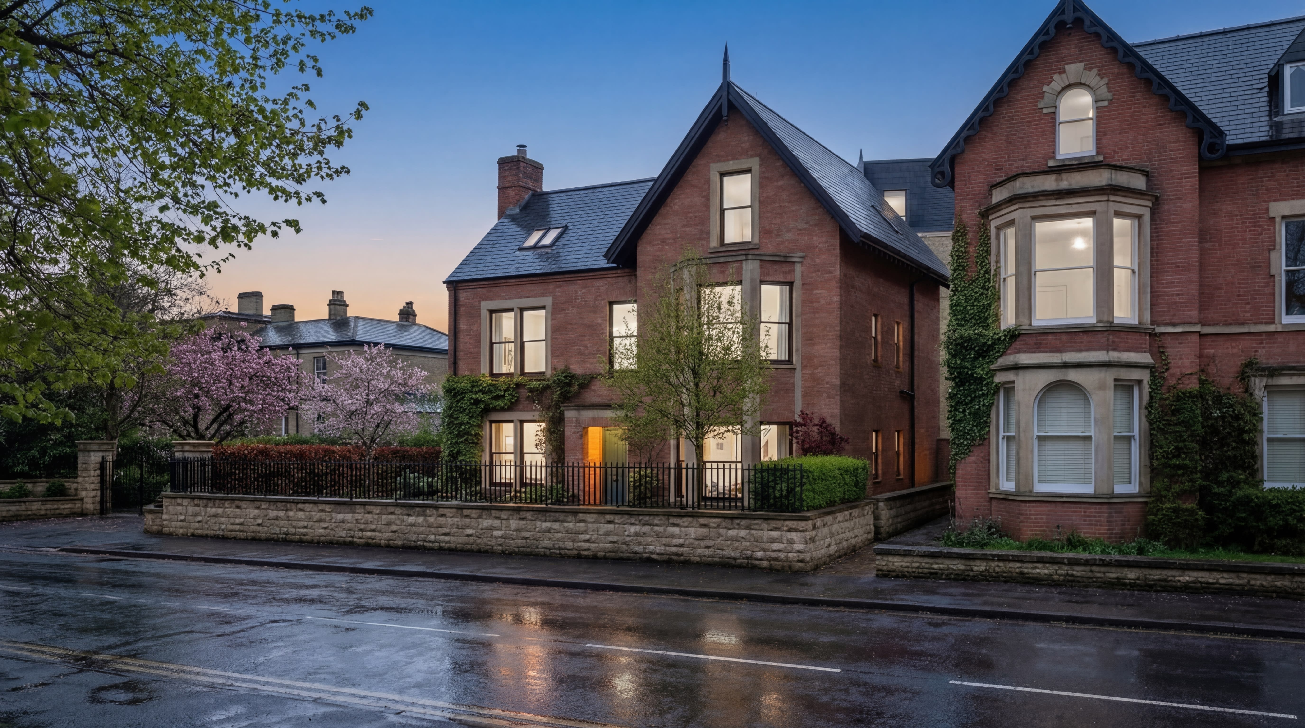 The design takes its lead from the Osmaston Villas immediately next door. Red brick, stone dressings, natural slate roof, gabled frontage to the street, consistent setback — the new building completes the frontage rather than imposing on it. It's identifiably a contemporary building rather than a pastiche, but it reads as part of the same family at street level.