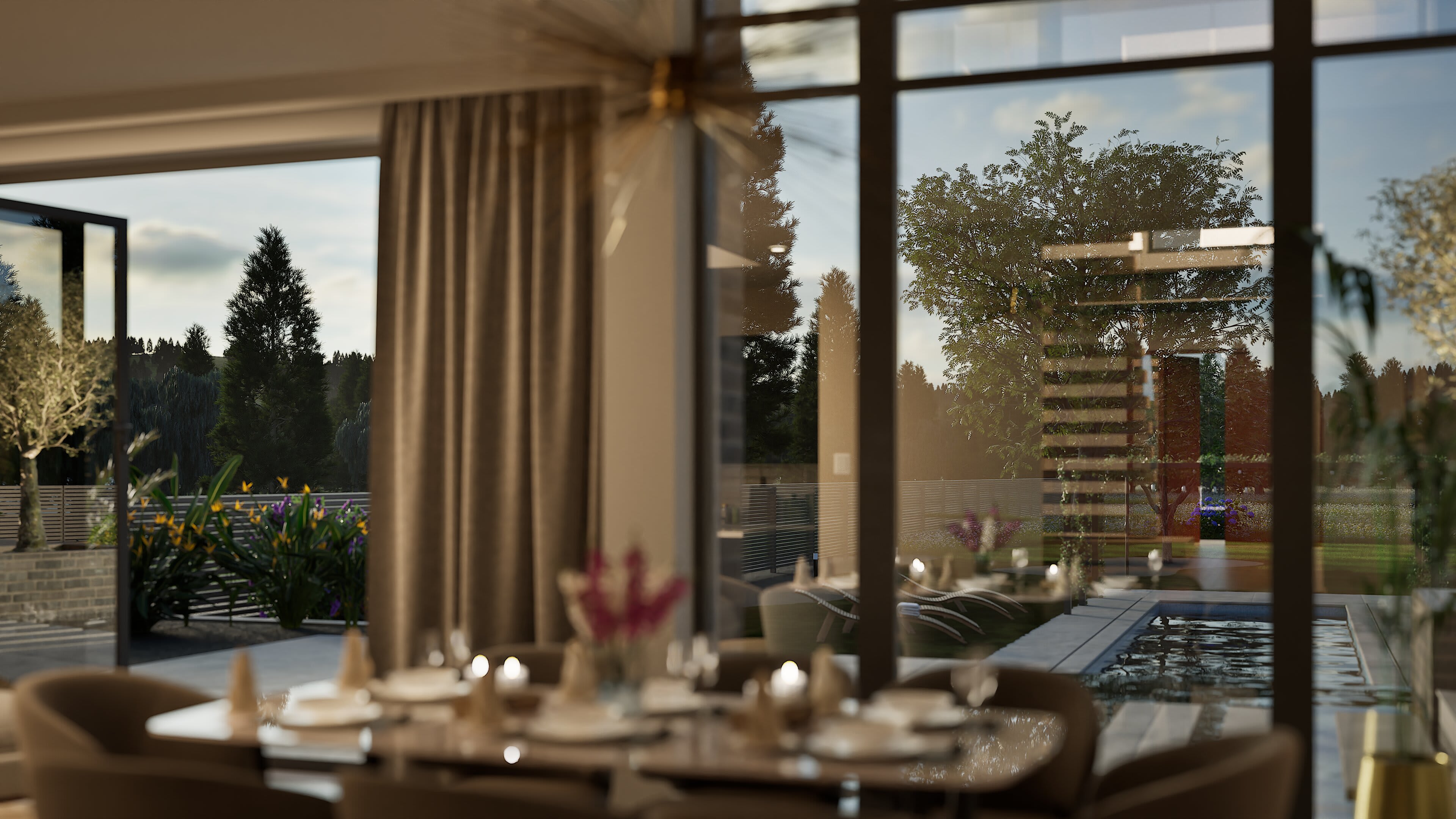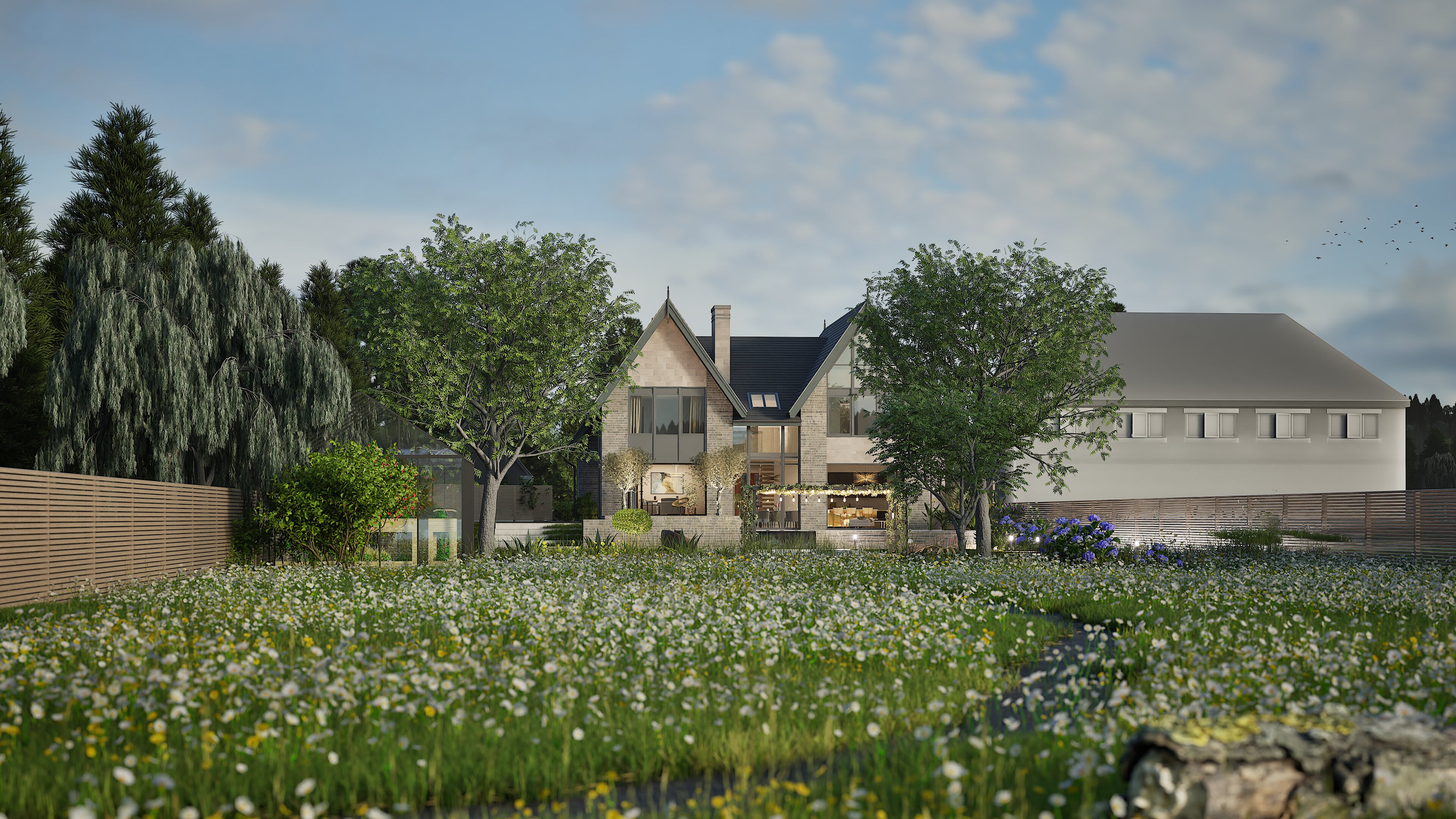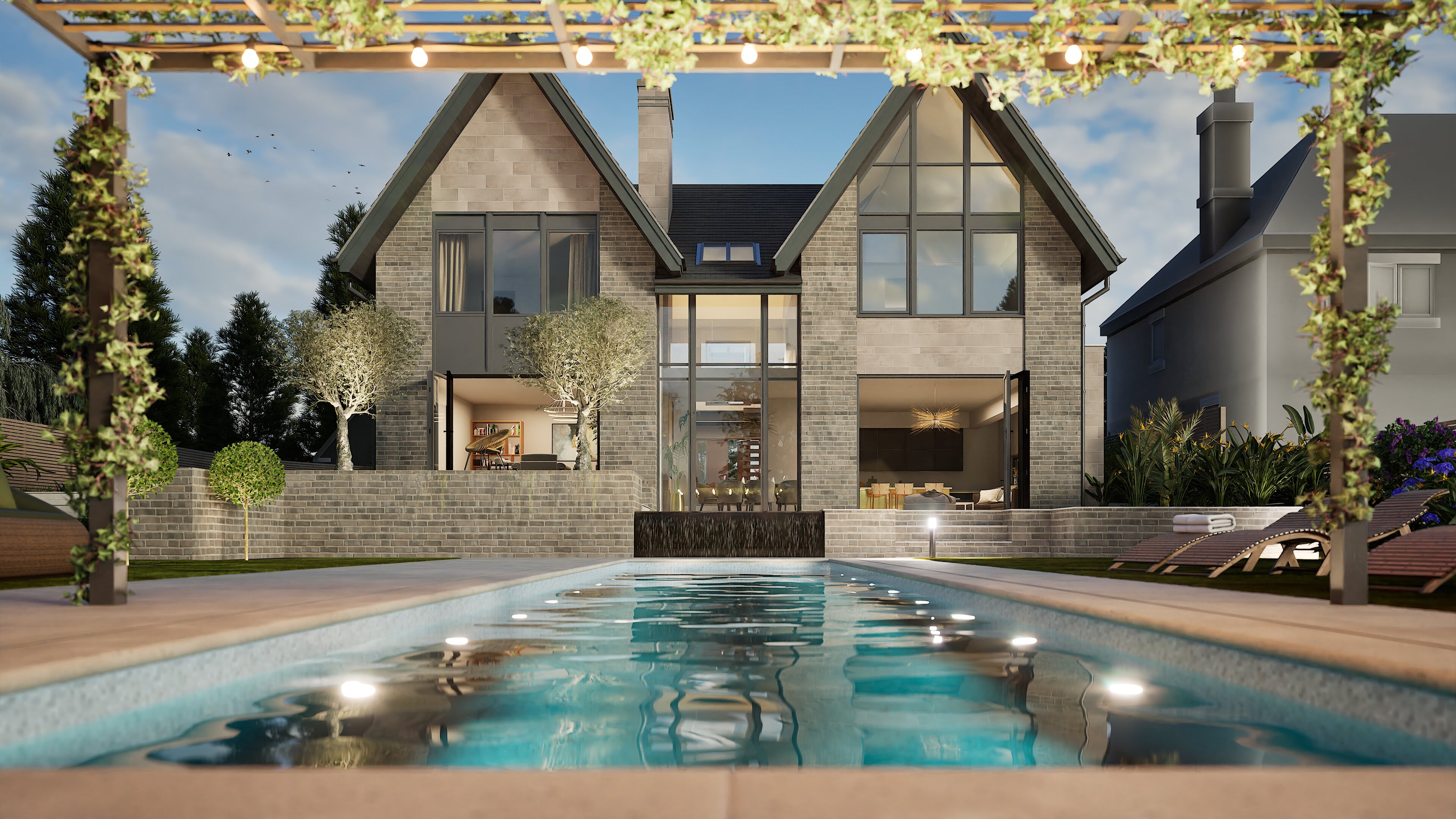 We've replaced generic landscaping with something more thoughtful. Manicured gardens transition to rural planting that connects with the farmed fields beyond. A 40-meter lap pool runs the length of the plot, partially covered by a striking pergola. The reflection pond creates an infinity effect that makes the whole site feel twice as spacious.