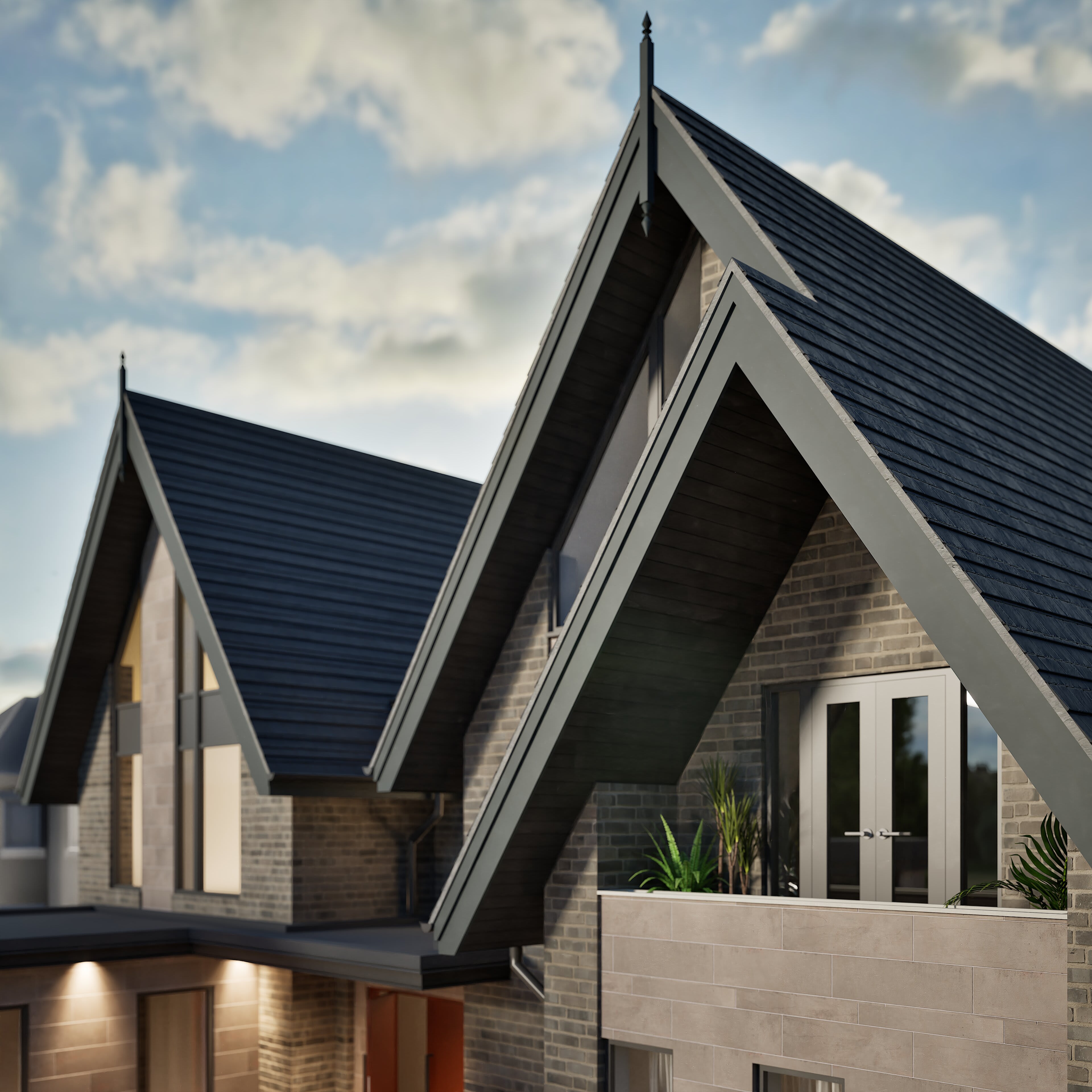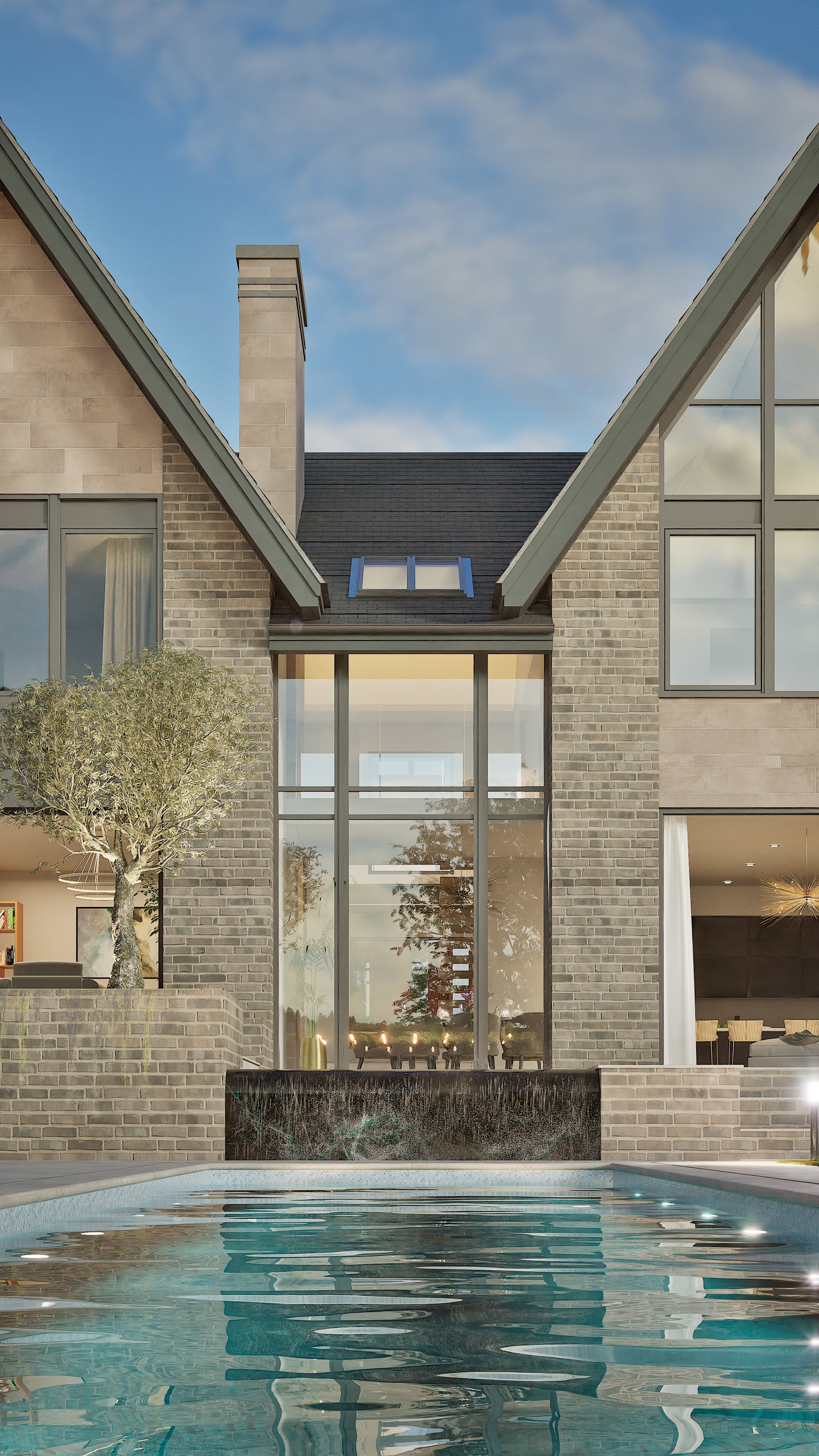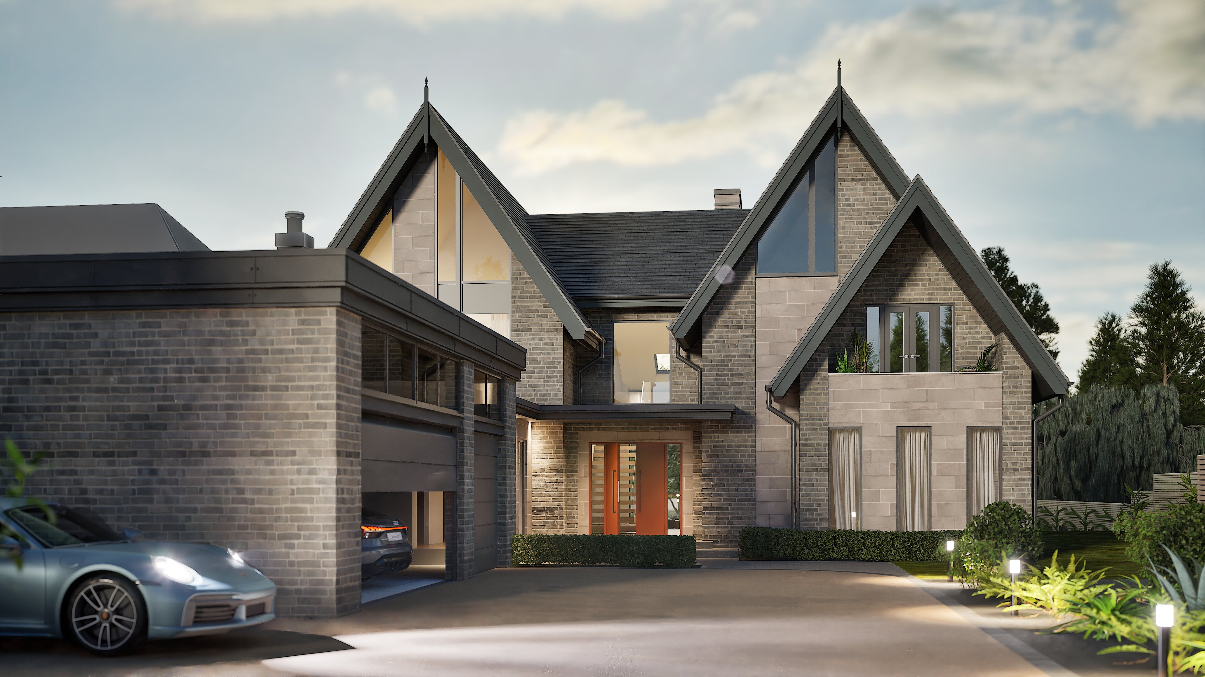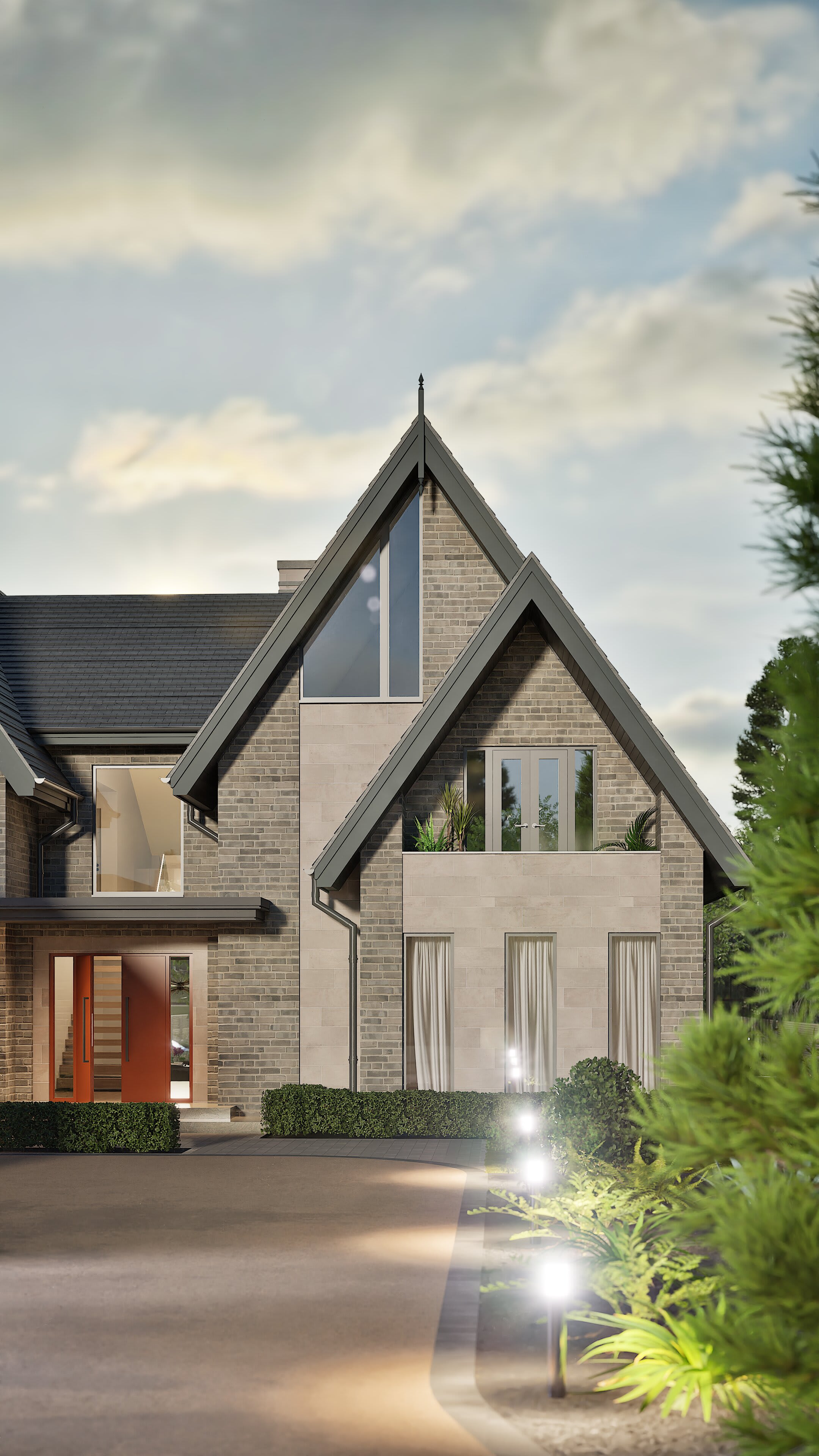 Buff and grey brick paired with smooth ashlar stone and precision aluminium details create a contemporary language that respects its village context. Steep gable pitches and slender finials give the roofline the presence this plot has been waiting for. Elongated windows in the gables flood the interior with natural light while creating architectural drama that stops people in their tracks.