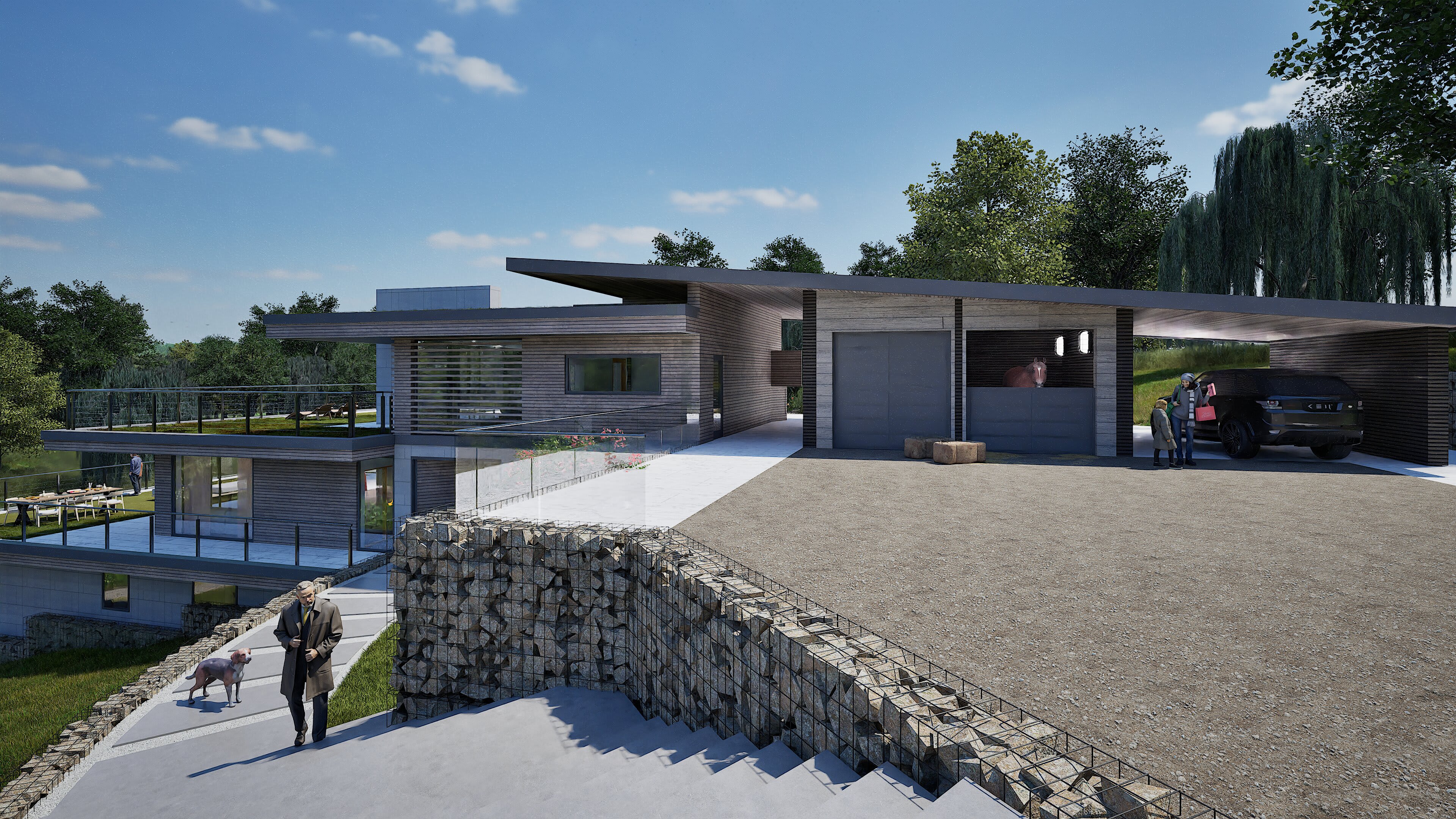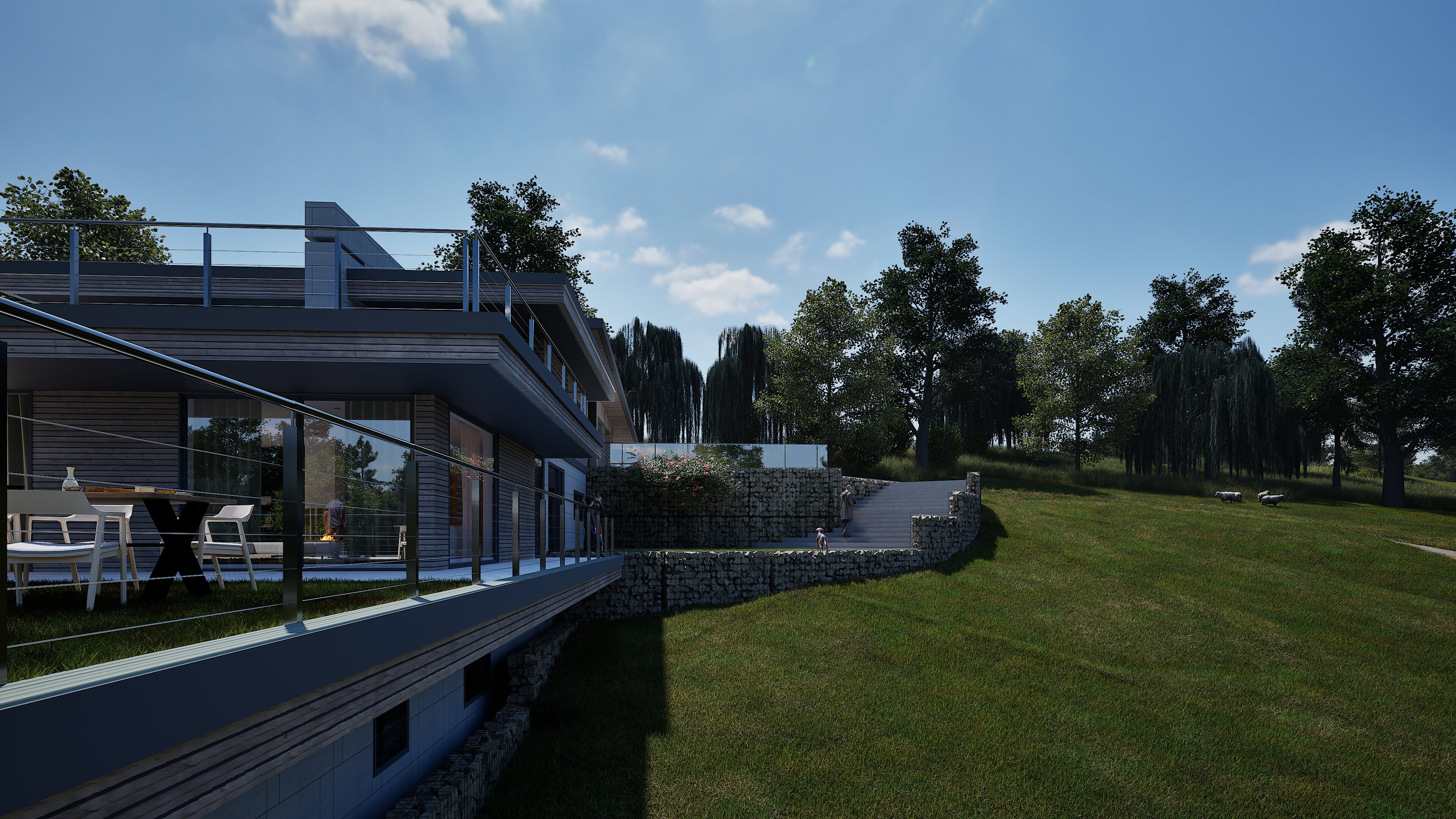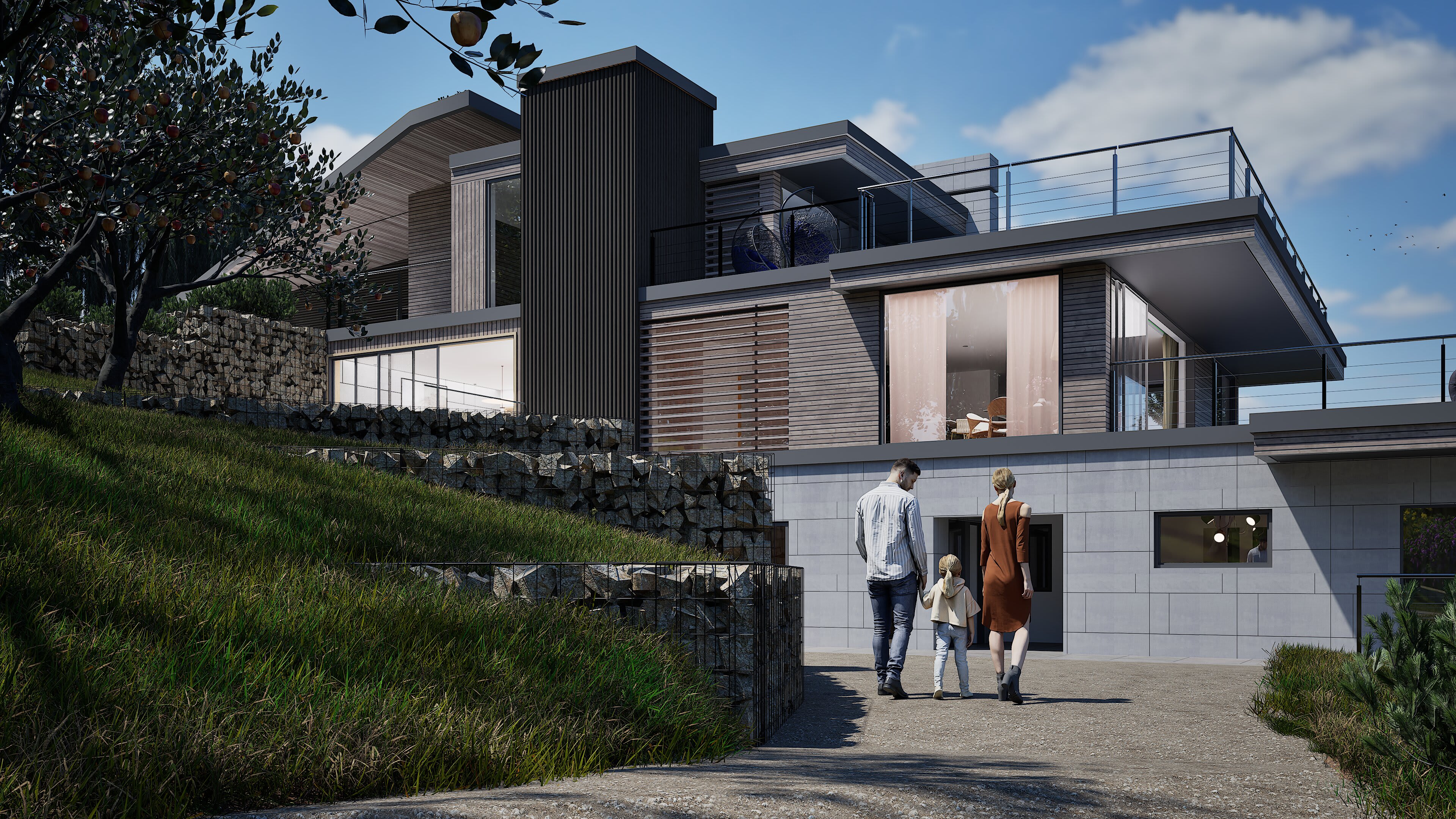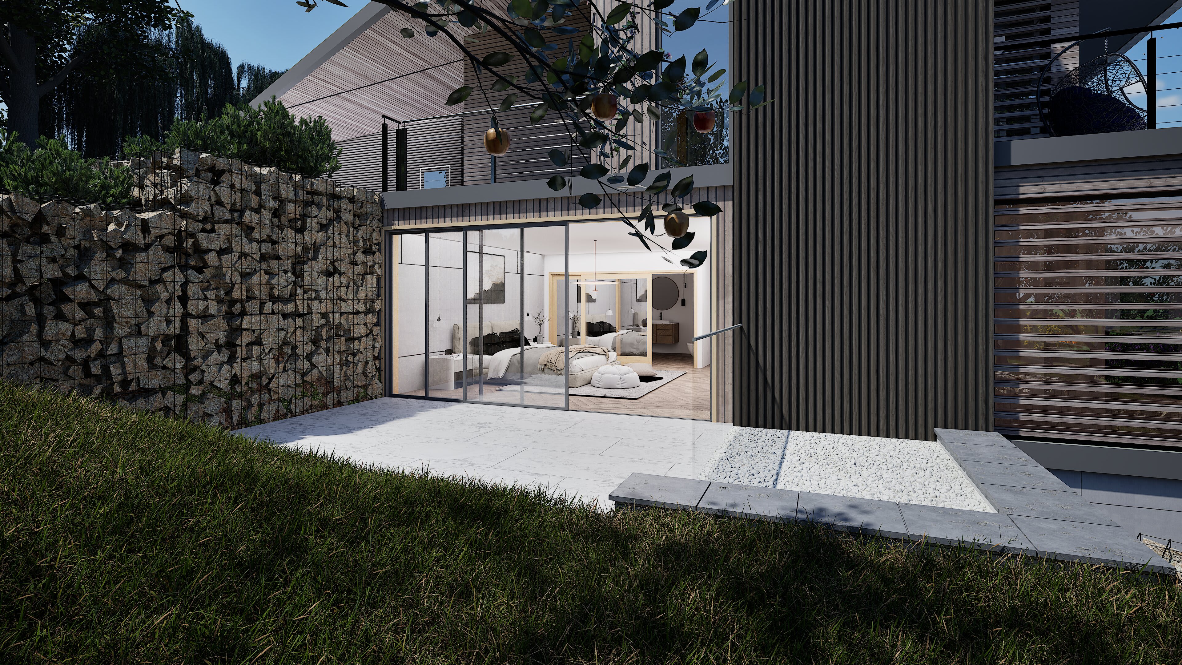 The architecture balances sleek contemporary lines with unashamedly modern materials: composite timber cladding that stays looking sharp without the maintenance headache and cost, Equitone cement panels for crisp modern edges, aluminium extrusions that catch the light just right, and Gabion walls of proper local stone—because at least something should be from around here. Living spaces flow between levels, creating distinct zones for family gatherings, quiet retreats, and entertaining that starts in the kitchen and migrates across multiple terraces.
