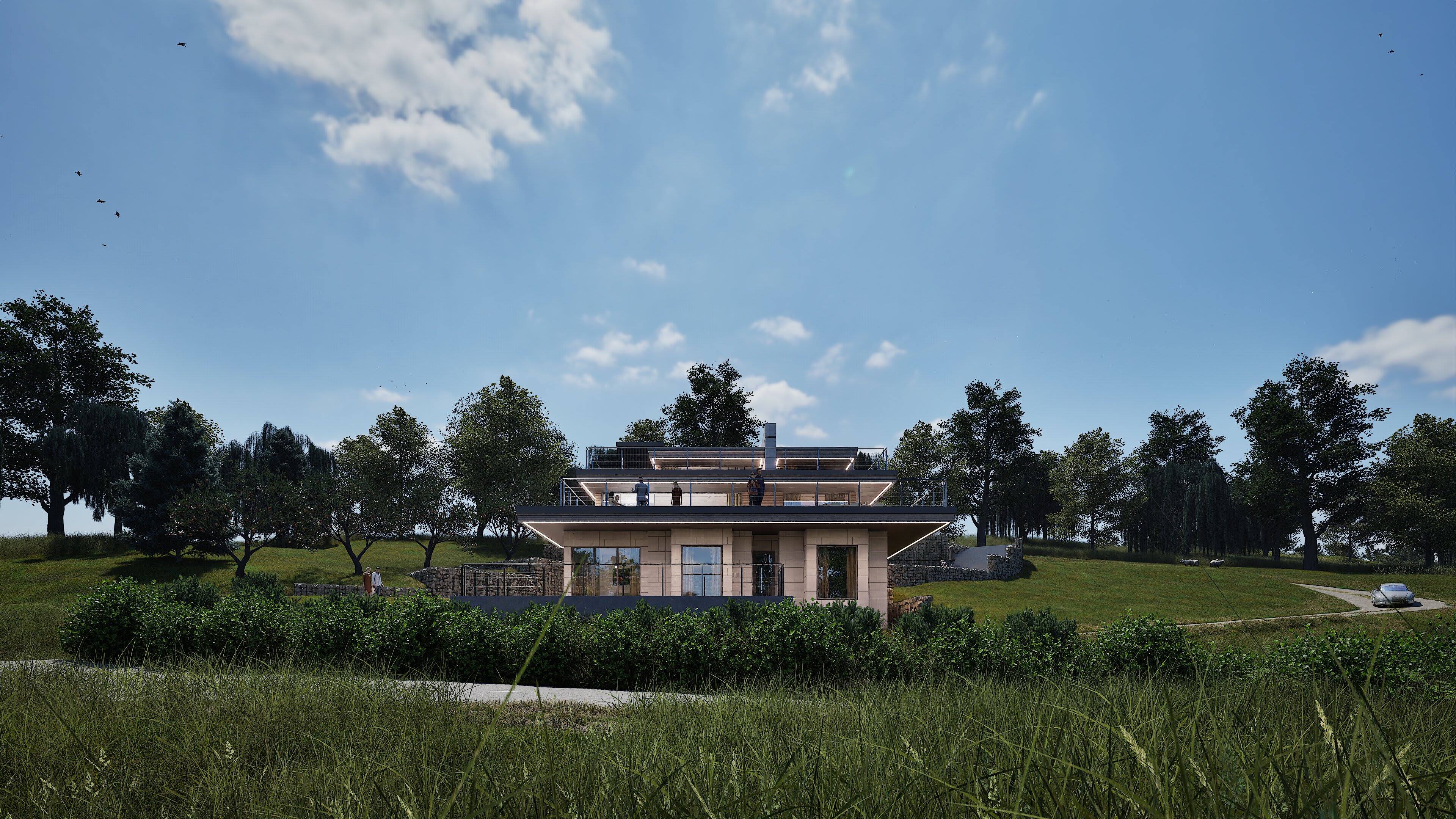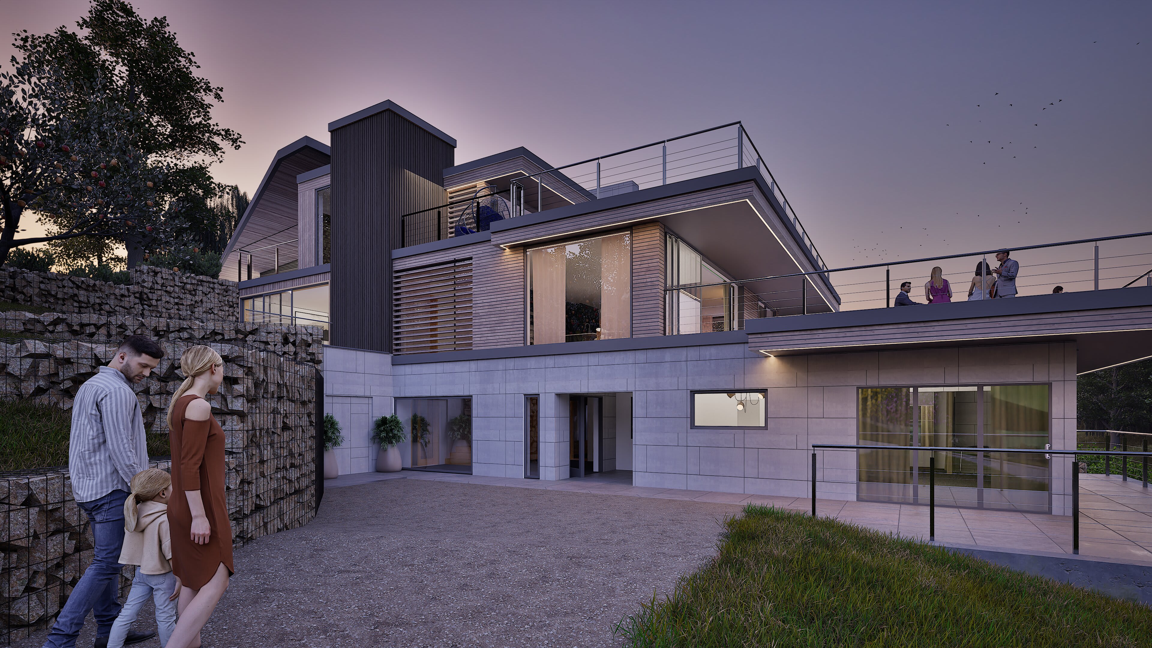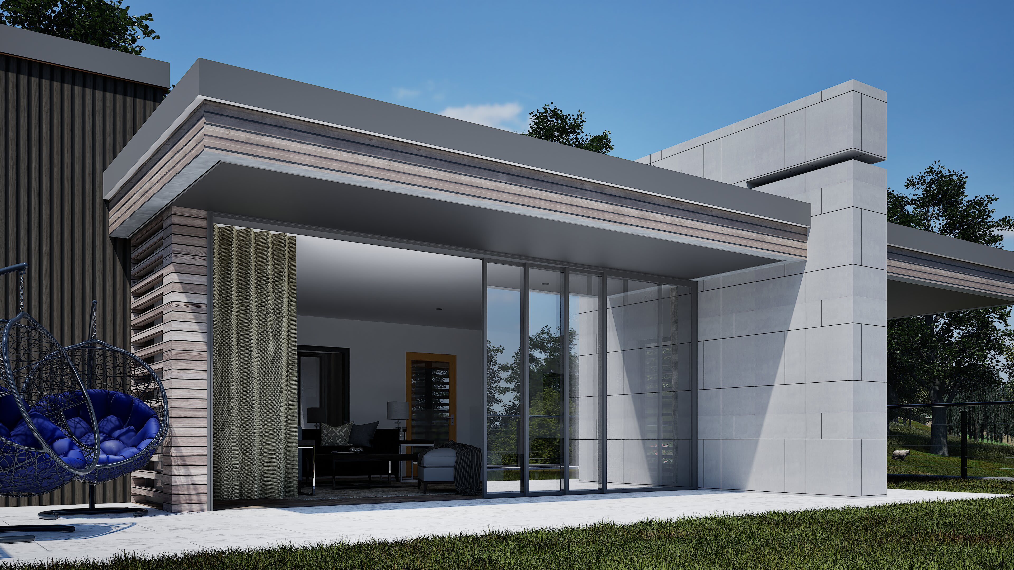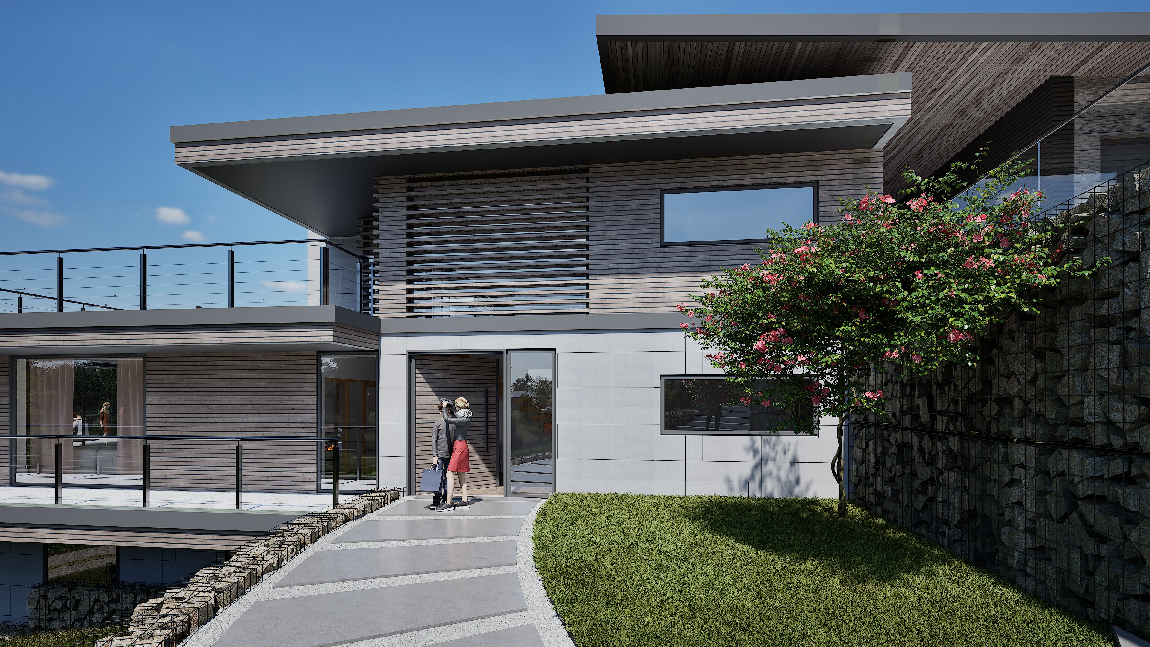 The architecture balances sleek contemporary lines with unashamedly modern materials: composite timber cladding that stays looking sharp without the maintenance headache and cost, Equitone cement panels for crisp modern edges, aluminium extrusions that catch the light just right, and Gabion walls of proper local stone—because at least something should be from around here. Living spaces flow between levels, creating distinct zones for family gatherings, quiet retreats, and entertaining that starts in the kitchen and migrates across multiple terraces.
