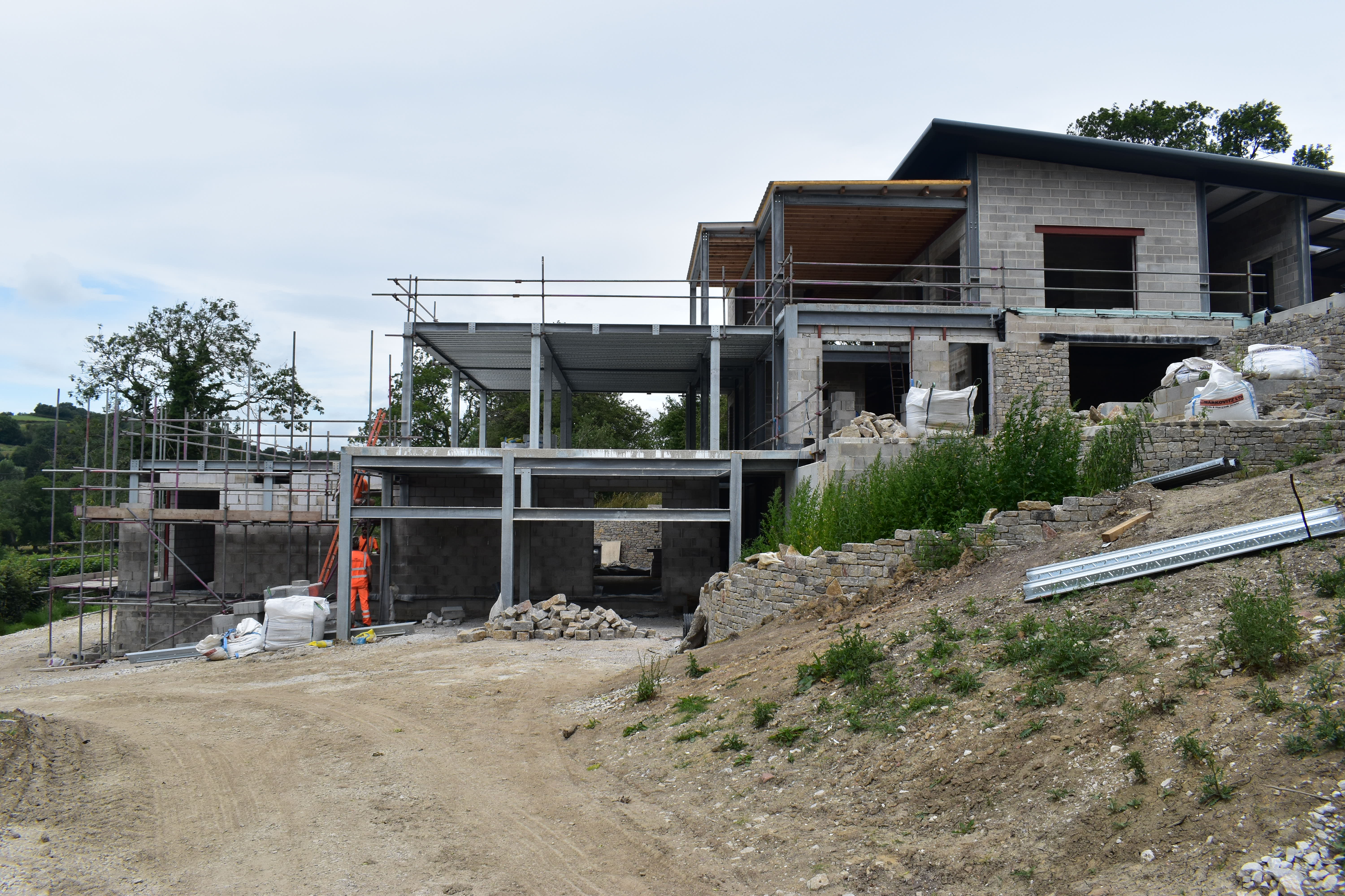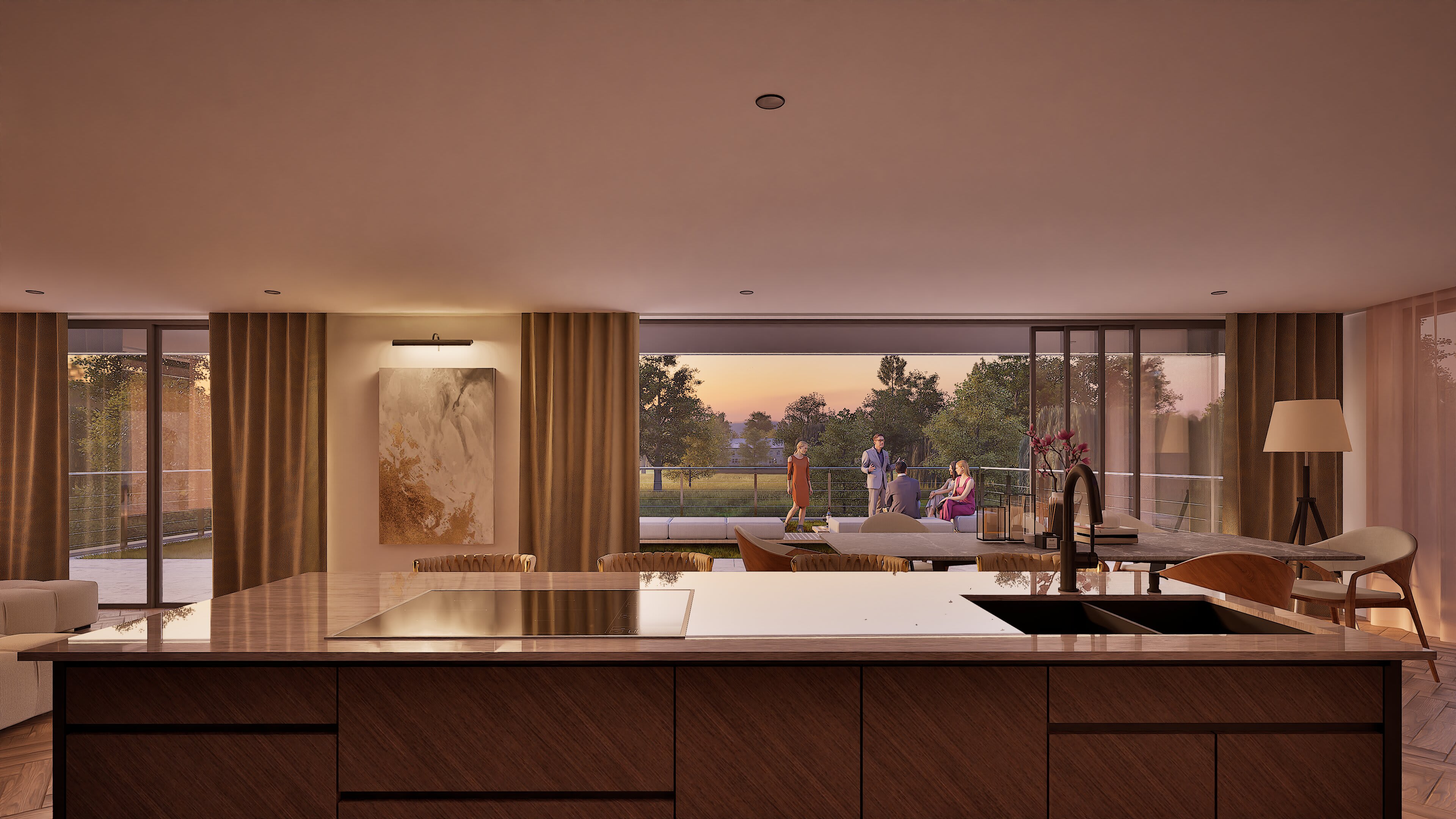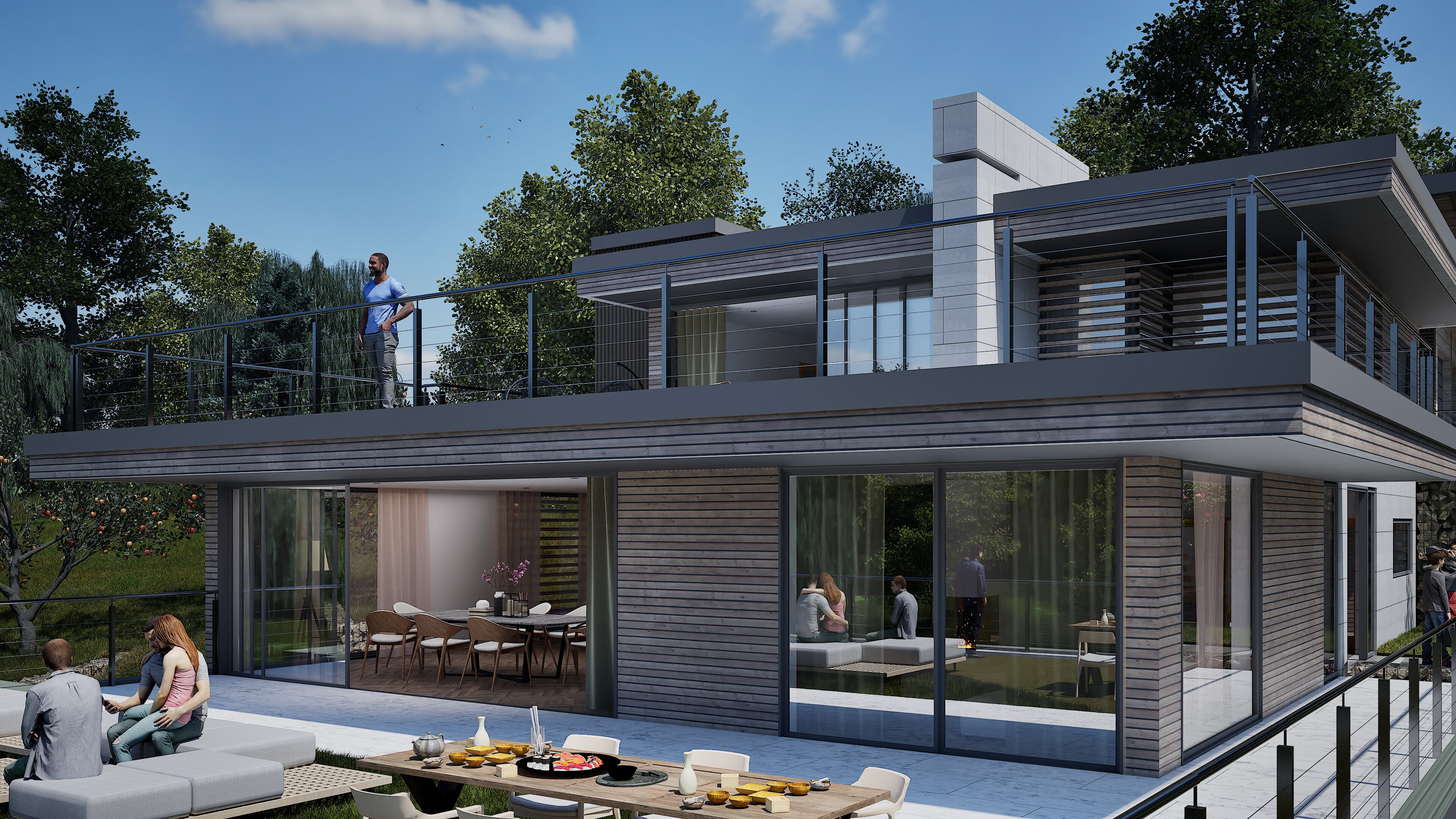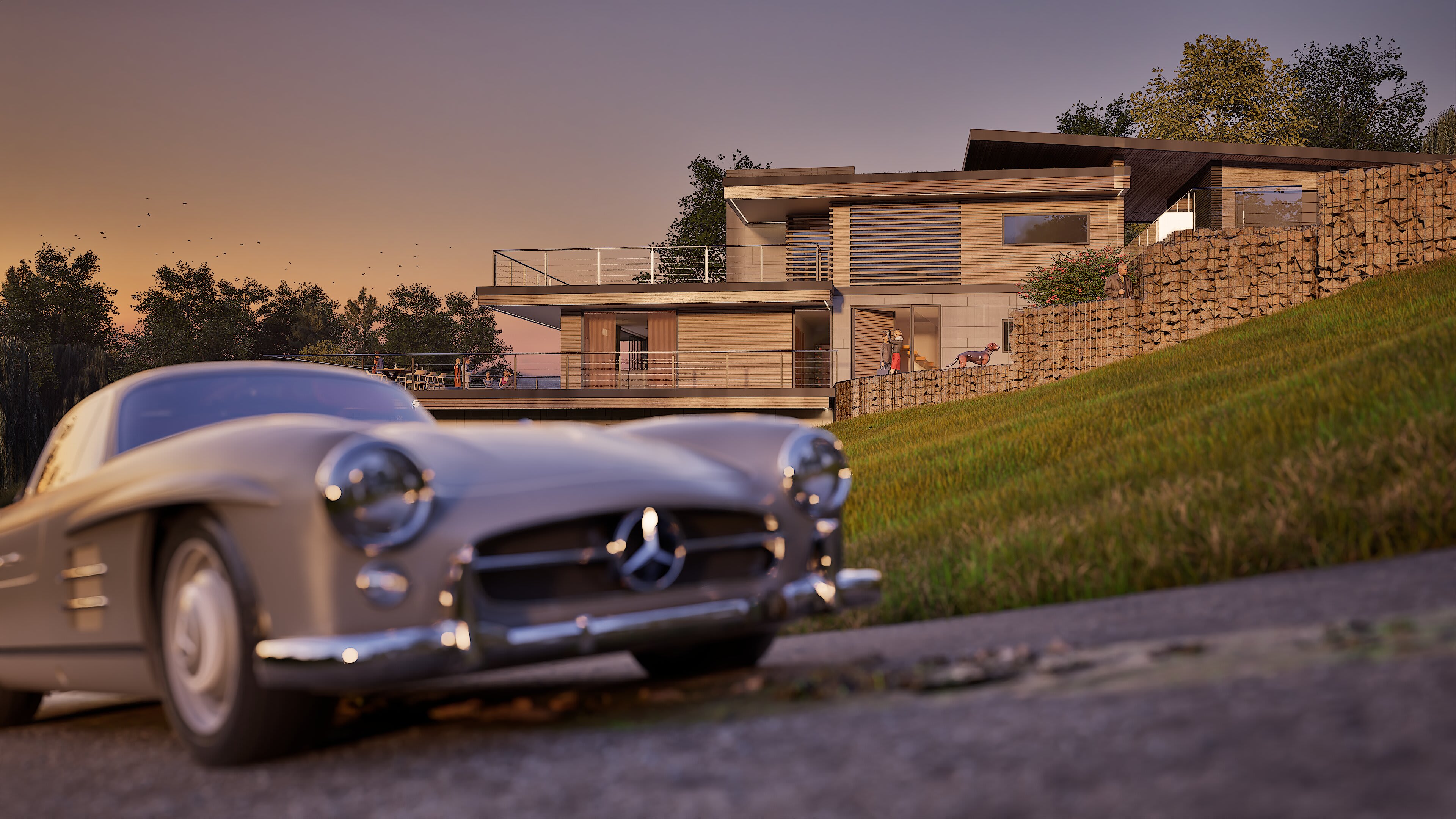 The architecture balances sleek contemporary lines with unashamedly modern materials: composite timber cladding that stays looking sharp without the maintenance headache and cost, Equitone cement panels for crisp modern edges, aluminium extrusions that catch the light just right, and Gabion walls of proper local stone—because at least something should be from around here. Living spaces flow between levels, creating distinct zones for family gatherings, quiet retreats, and entertaining that starts in the kitchen and migrates across multiple terraces.