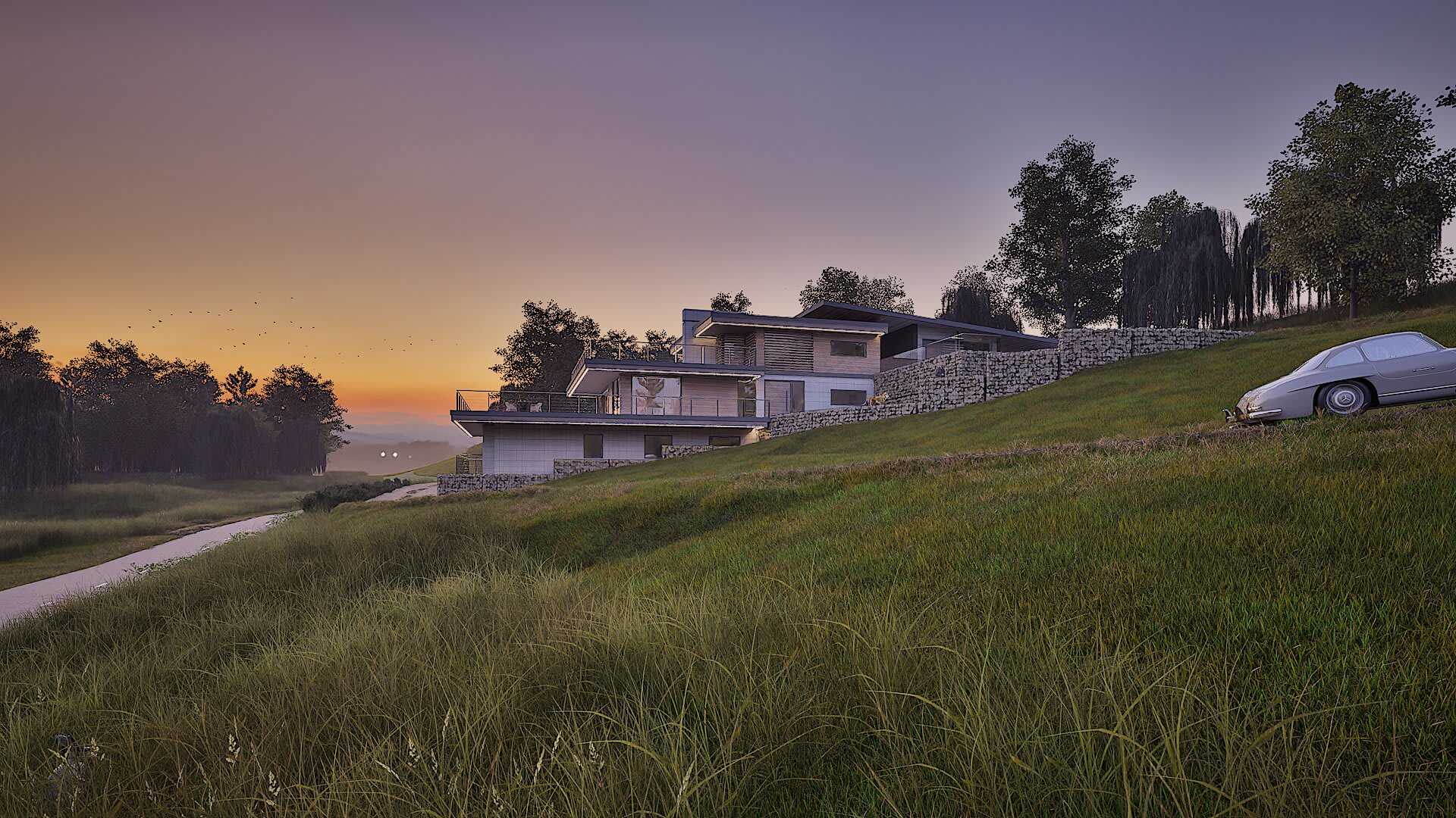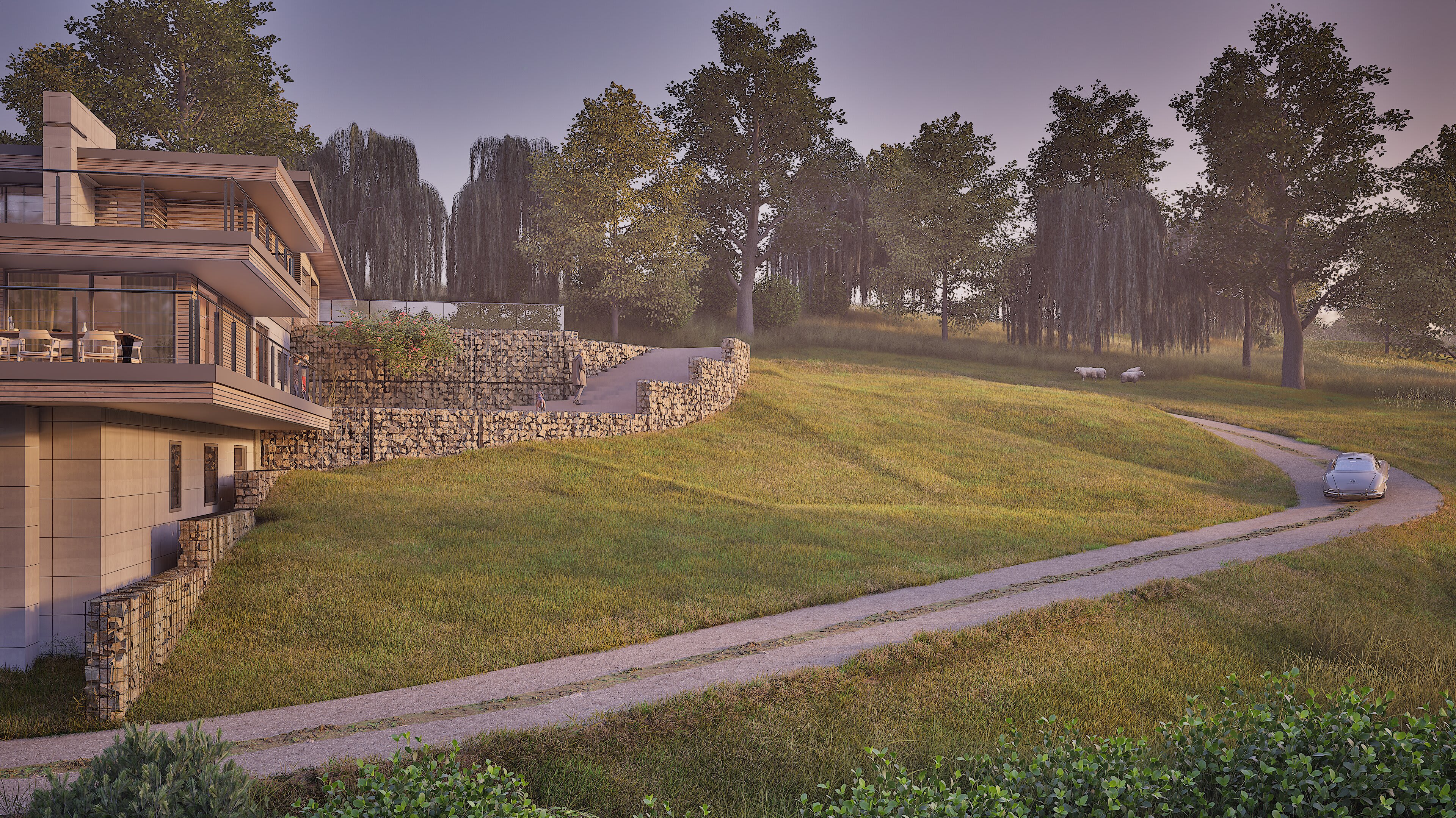The design steps down the natural hillside, creating terraces that follow the land's own logic. Each level reveals new views across the countryside while providing practical access for everything from morning animal feeds to a glass of vino on the sunset terrace.