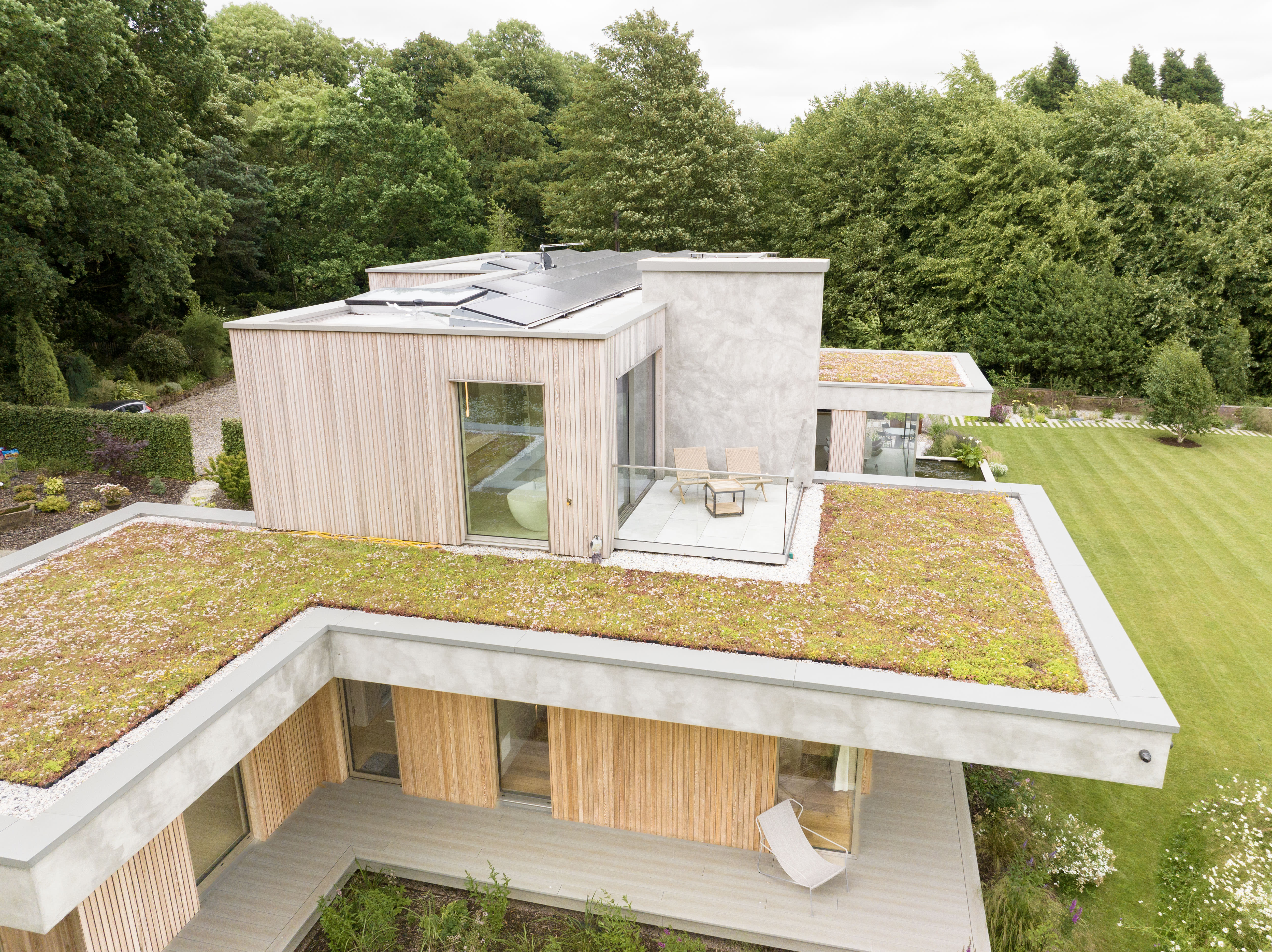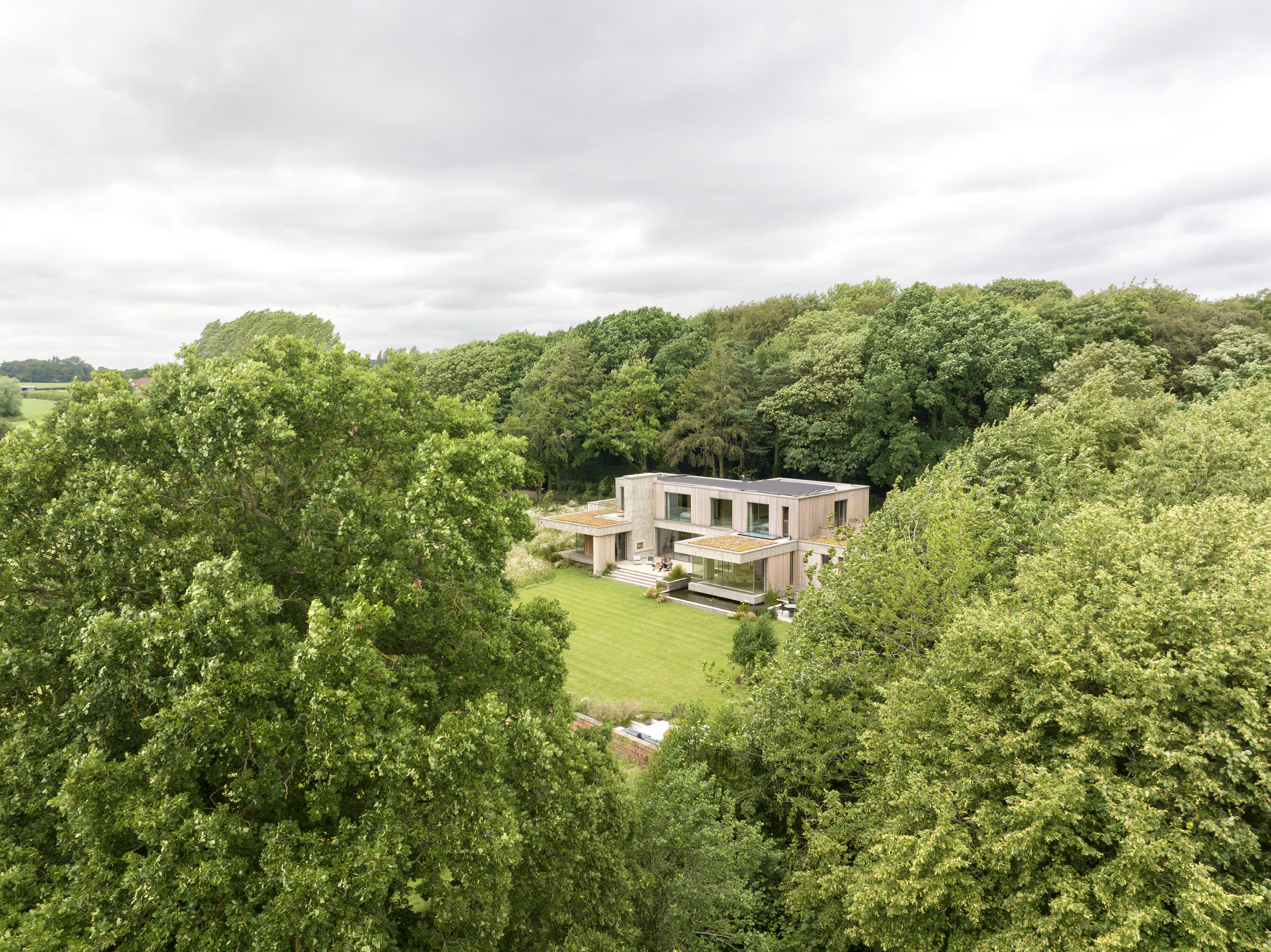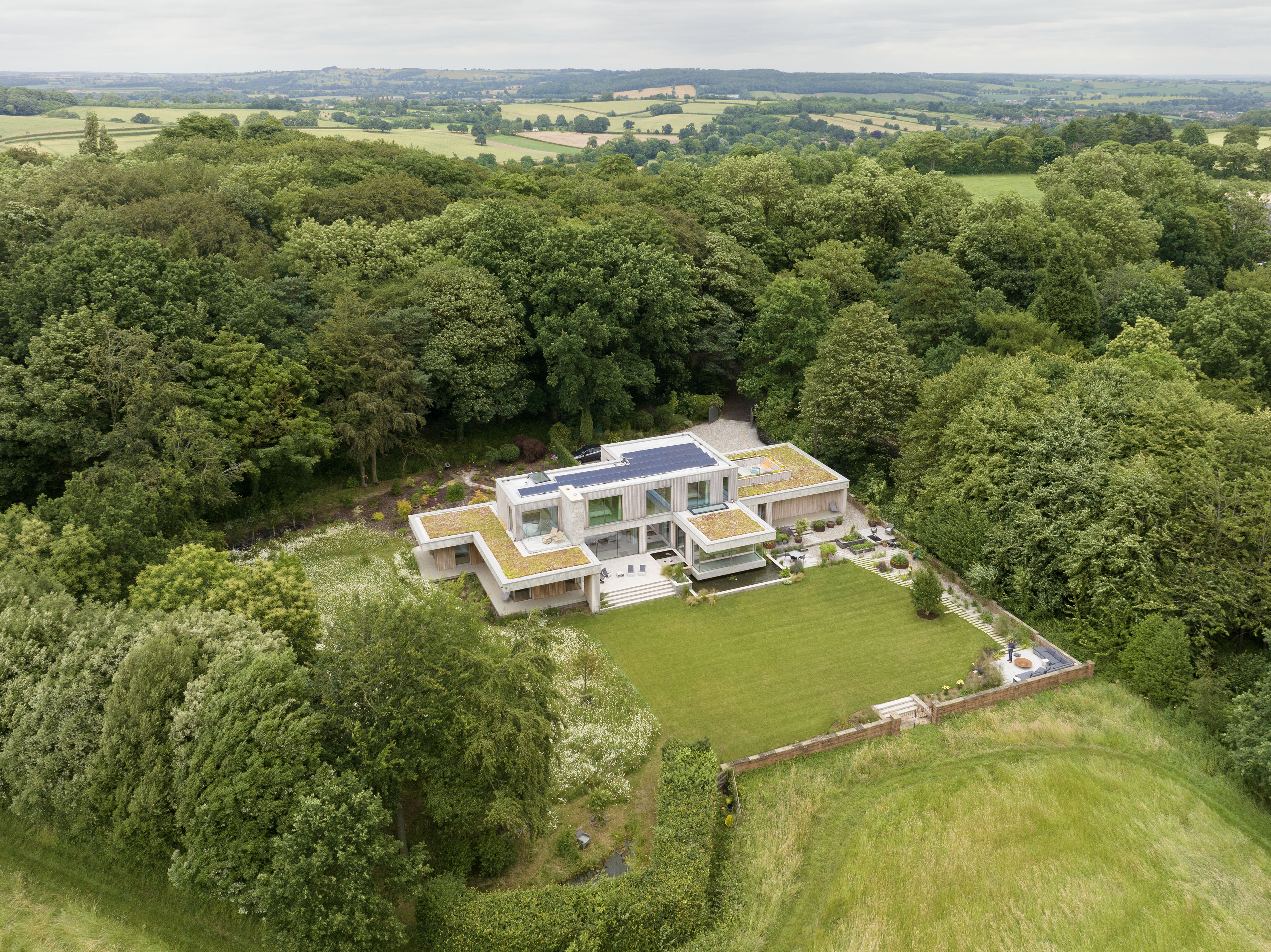 The site made their dream both possible and gloriously challenging. Three sides wrapped in dense woodland, the fourth opening to miles of rolling countryside. Complete privacy—the kind where your nearest neighbor is probably a badger—but a slope that could either make the design sing or send it tumbling into the trees.